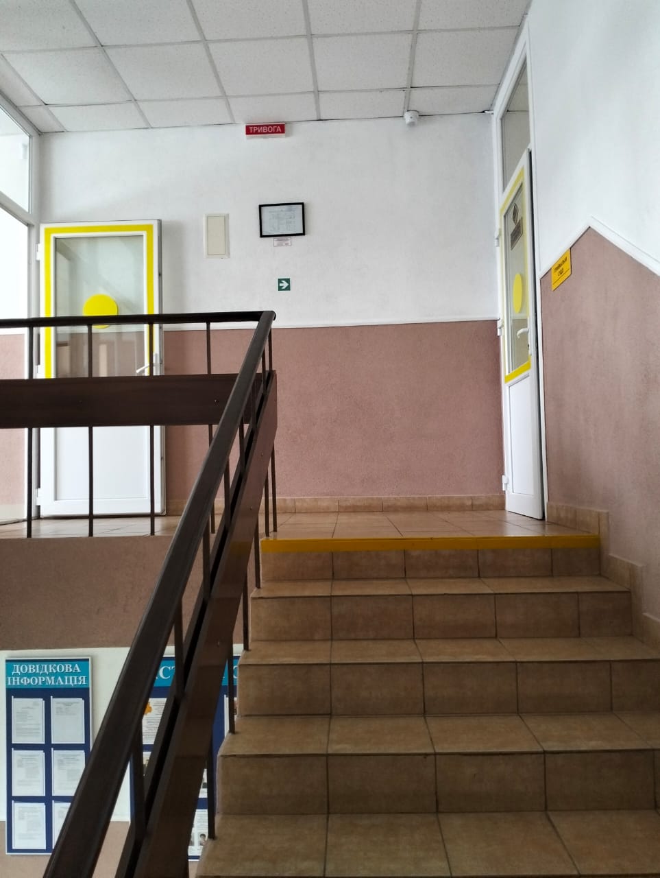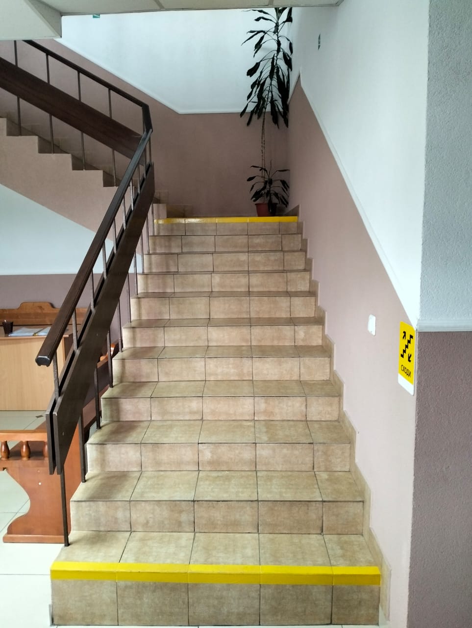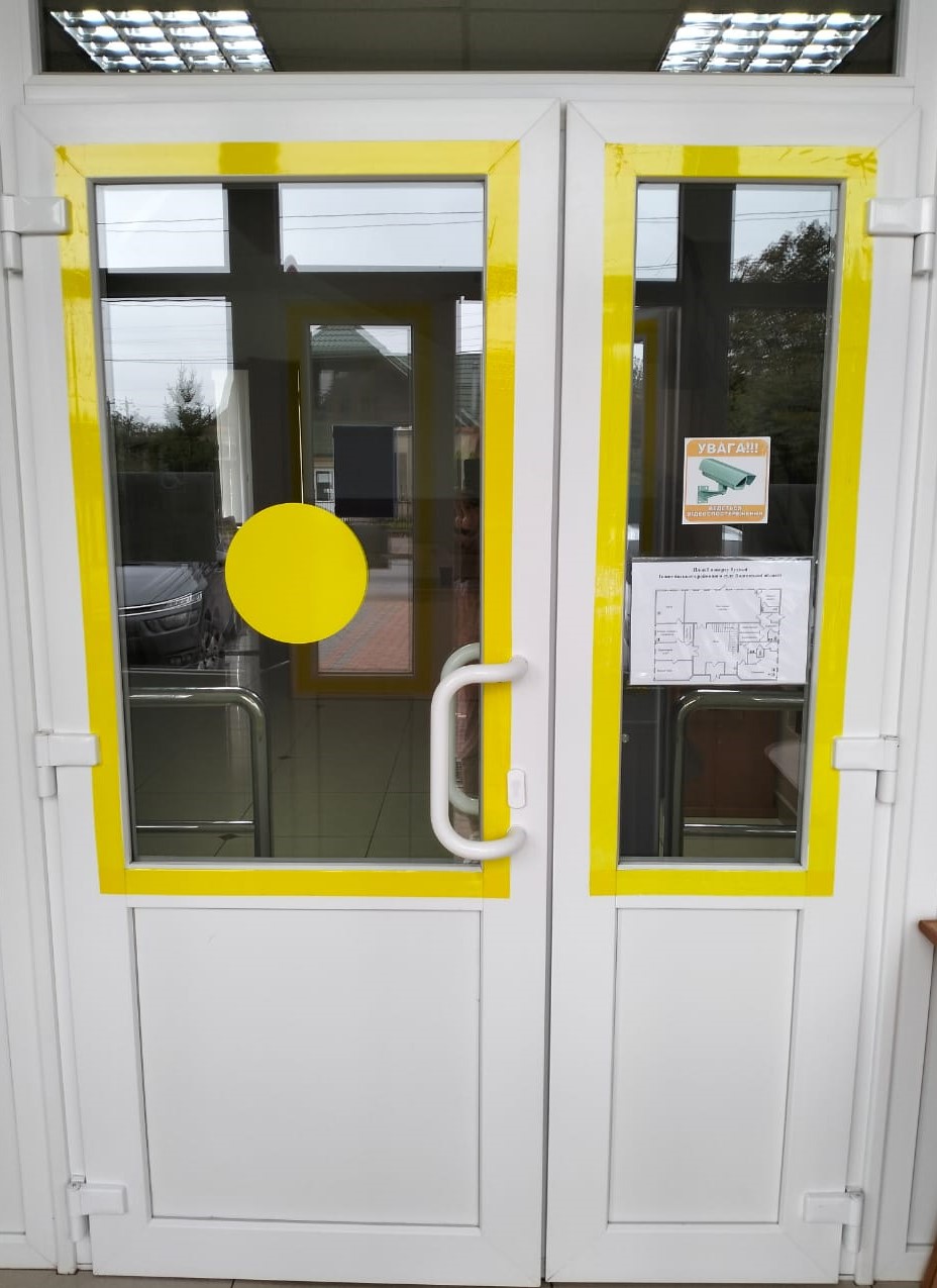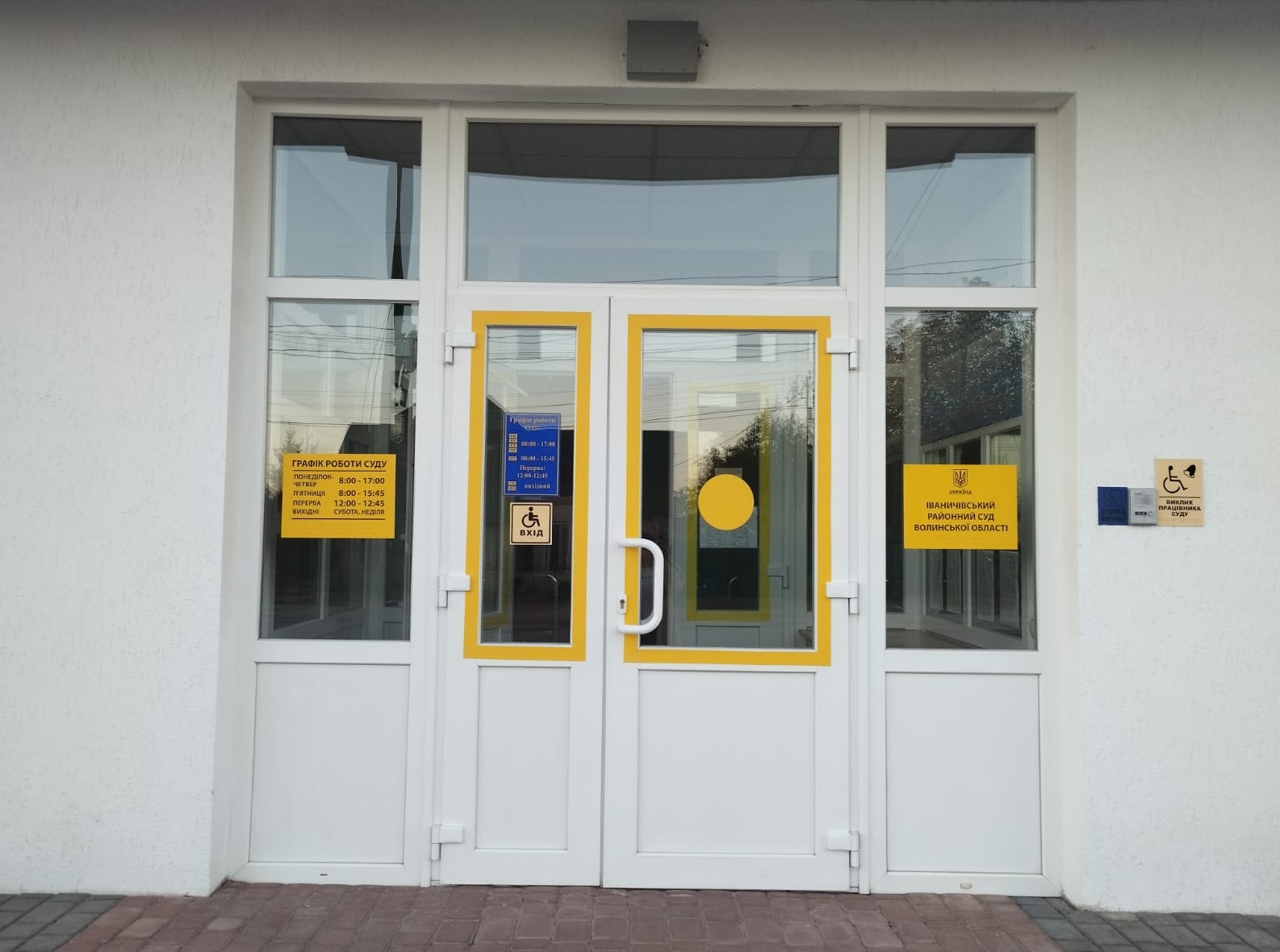 Сходи на верх та двері на 2 поверсі будівлі суду також обклеєні жовтою сигнальною стрічкою. Праворуч на стіні є тактильна табличка "Сходи", а на дверях - наліпка «Обережно! Перешкода!»