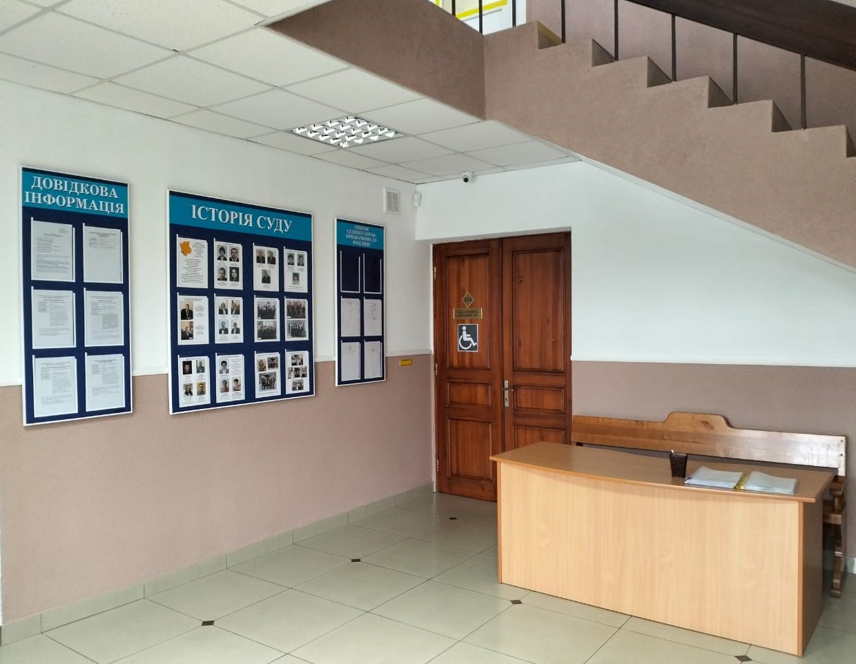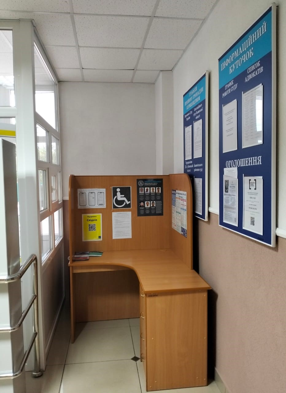 У фоє 1 першого поверху будівлі суду розміщено стенди з інформаційно-довідковою інформацією, а на столі, у легко доступному місці, папки із зразками процесуальних документів та іншою корисною інформацією.