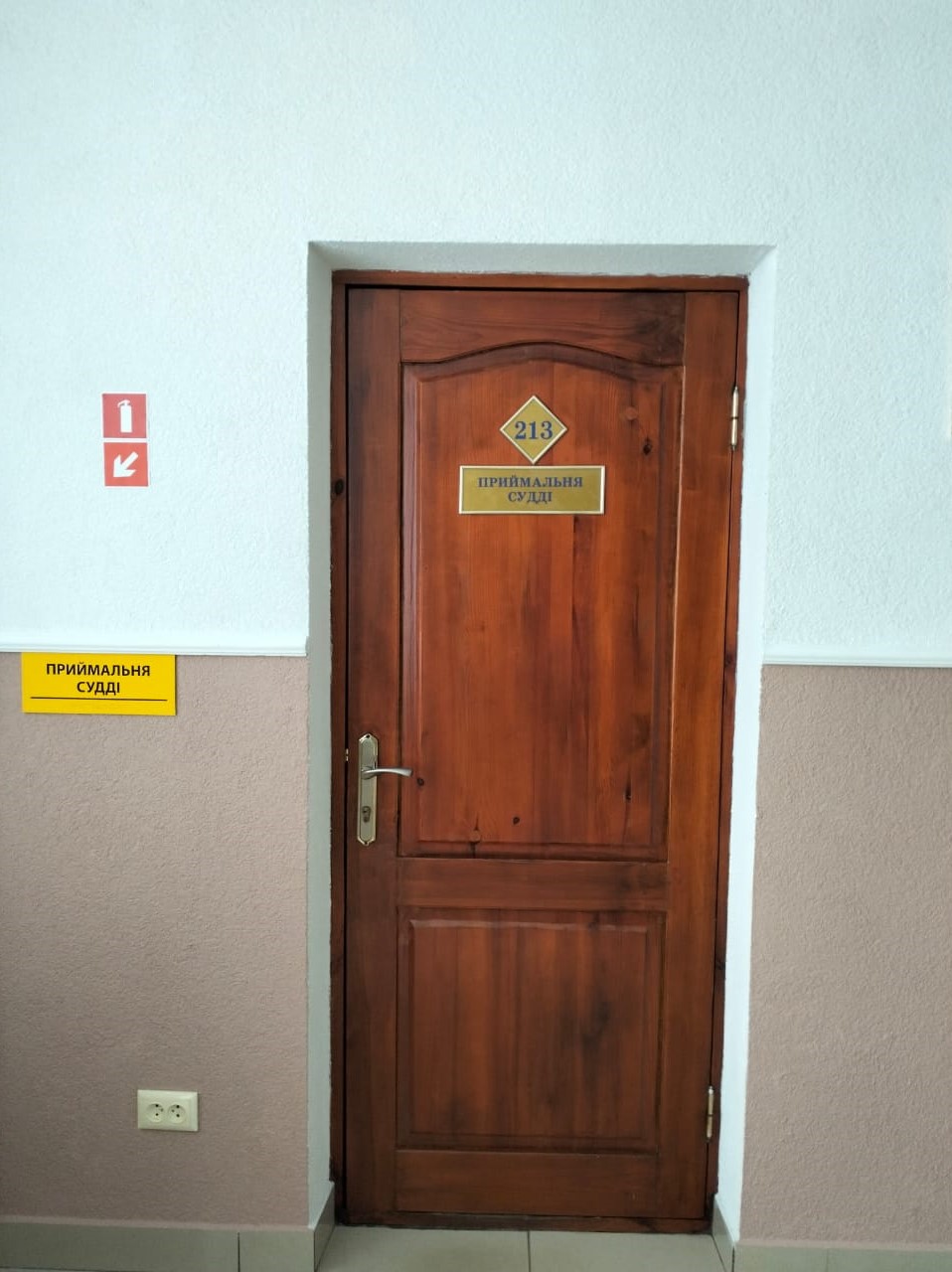 З правого боку на склі другої половини подвійних вхідних дверей розміщено план 1 поверху приміщення суду.